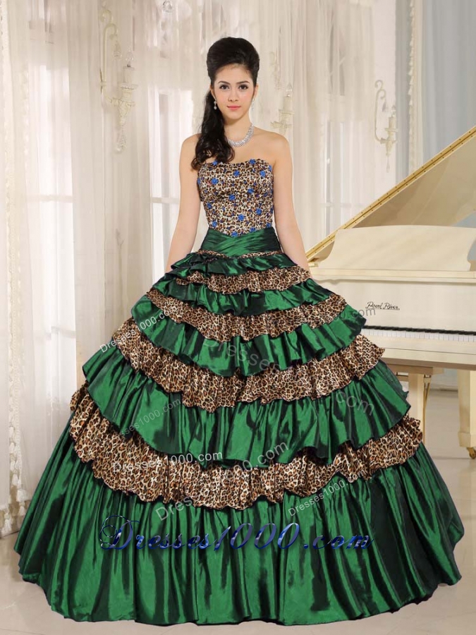 2014 Green Leopard Layers and Appliques Quinceanera Dress For Custom Made