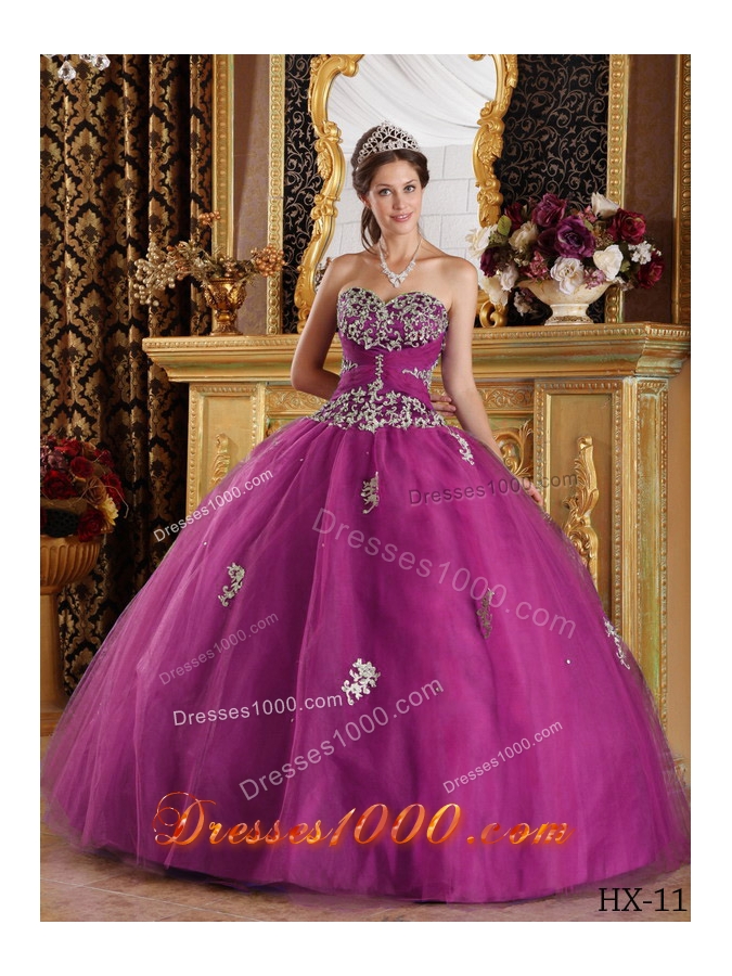 Fuchsia Sweetheart Tulle Quinceanera Gowns with White Appliques