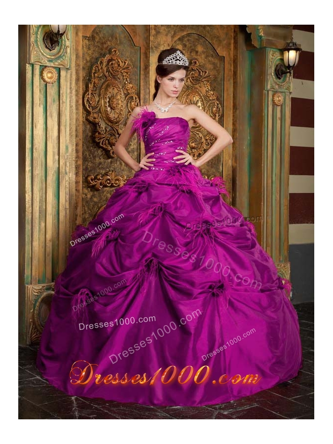 Fuchsia Strapless Taffeta Beading and Hand Made Flowers Sweet 15 Dresses