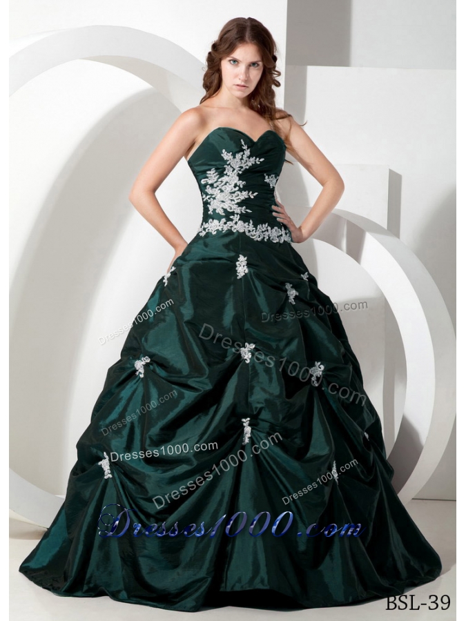 Elegant Dark Green Puffy Sweetheart Quinceanera Dresses with Taffeta Appliques