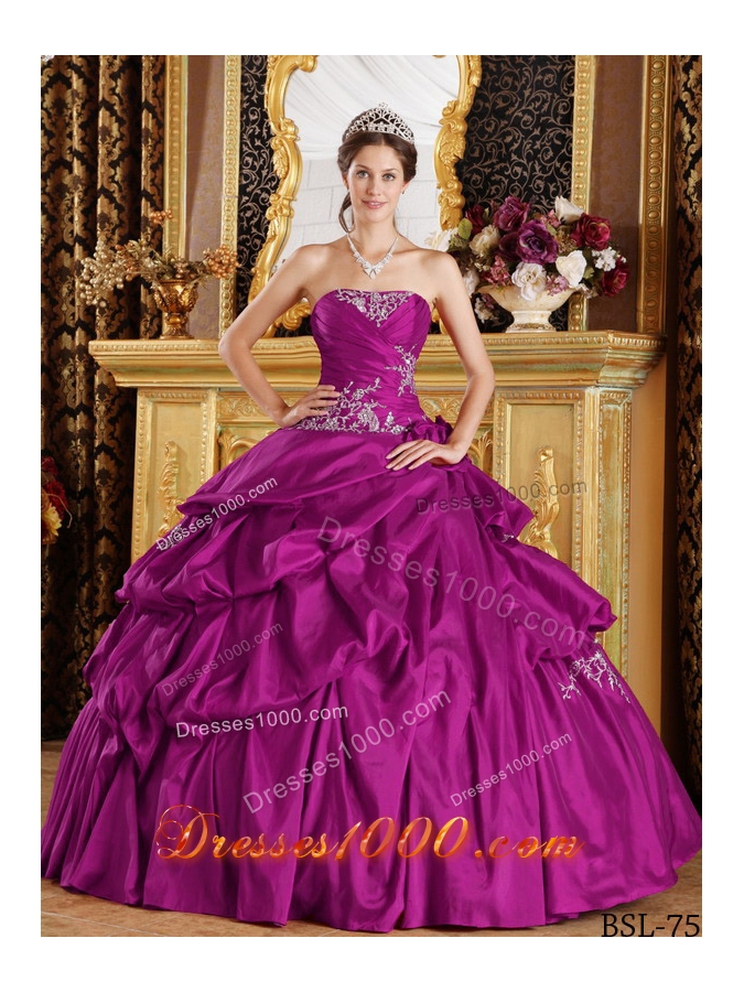 Strapless Taffeta Fuchsia Quinceanera Dress with White Appliques