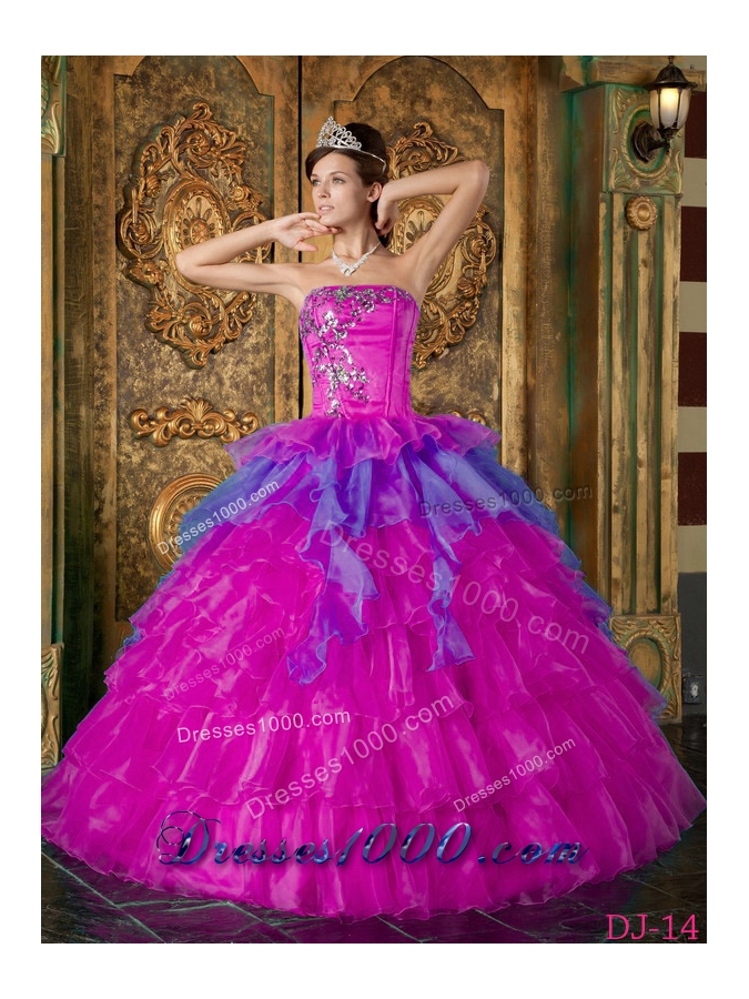 Appliques with Beading Organza Strapless Quinceanera Dress in Fuchsia