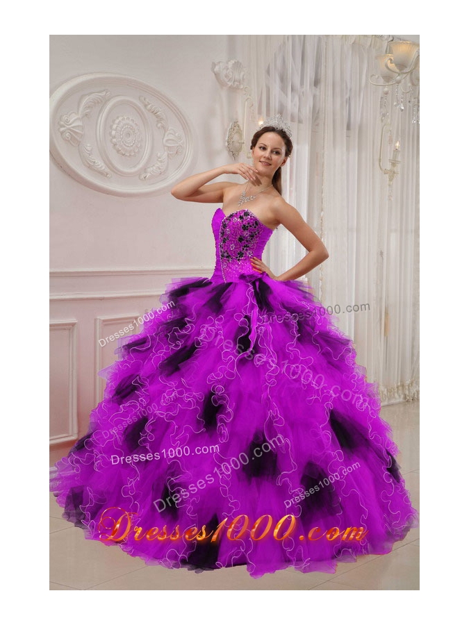 Purple and Black Sweetheart Orangza Beading and Ruffles Quinceanera Gown