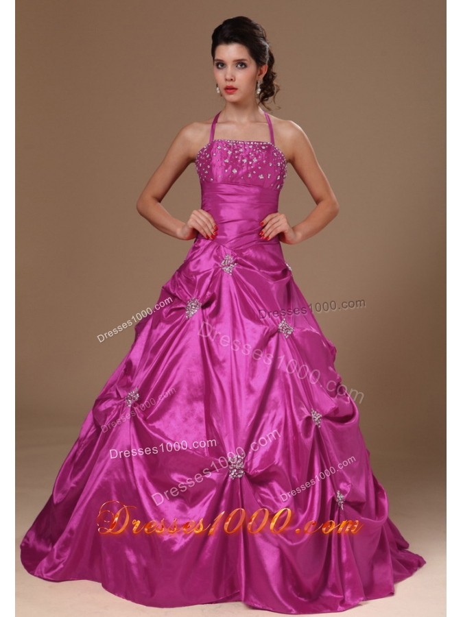 Pick-ups and Beading Halter Top A-line Fuchsia Quinceanera Dresses For Cheap