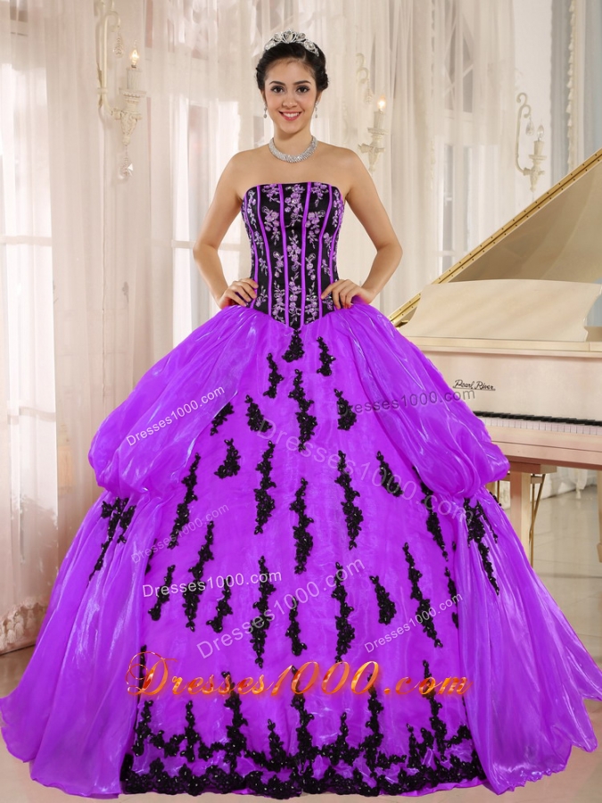 Strapless dresses are one of the sexier styles on the market today. They show just enough skin to be classy without being too revealing. This one features a lovely brocade style appliques across the whole dress. The amazing ball gown skirt is reminiscent of the old fashioned hoop skirts and is made from several layers of draped fabric that add another dimension of beauty to an already lovely gown. The dress sways beautifully across the floor when you move, as if you're floating on air. A lace up corset style closure in the back secures the dress in place.