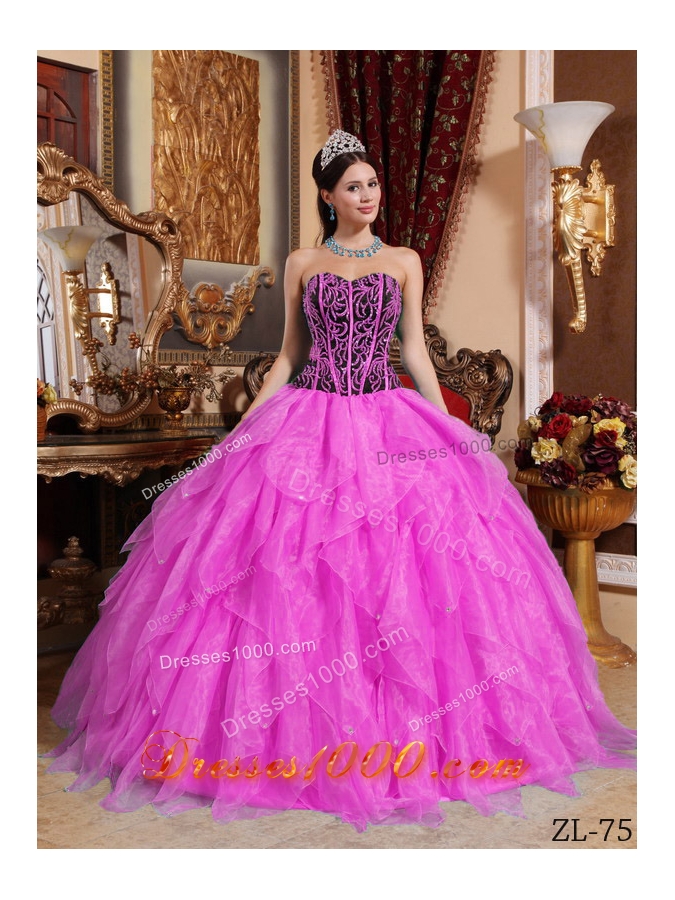 Hot Pink Ball Gown Sweetheart Floor-length Organza Embroidery with Beading Quinceanera Dress