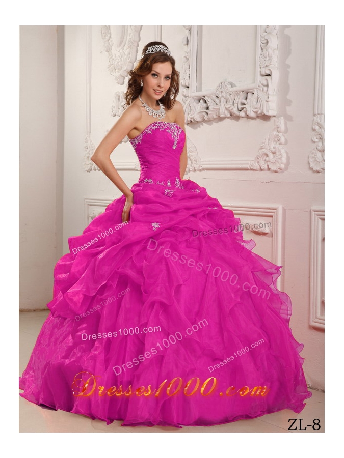 Hot Pink a-line organza quinceanera dress strapless design with ball gown silhouette.Flowy ruffles in extravagant draping down the skirt.Stunning tulle adorns the a-line ball gown skirt. Lace up back is fabulous on this gown.?An absolutely perfect gown when looking your best is a must.
