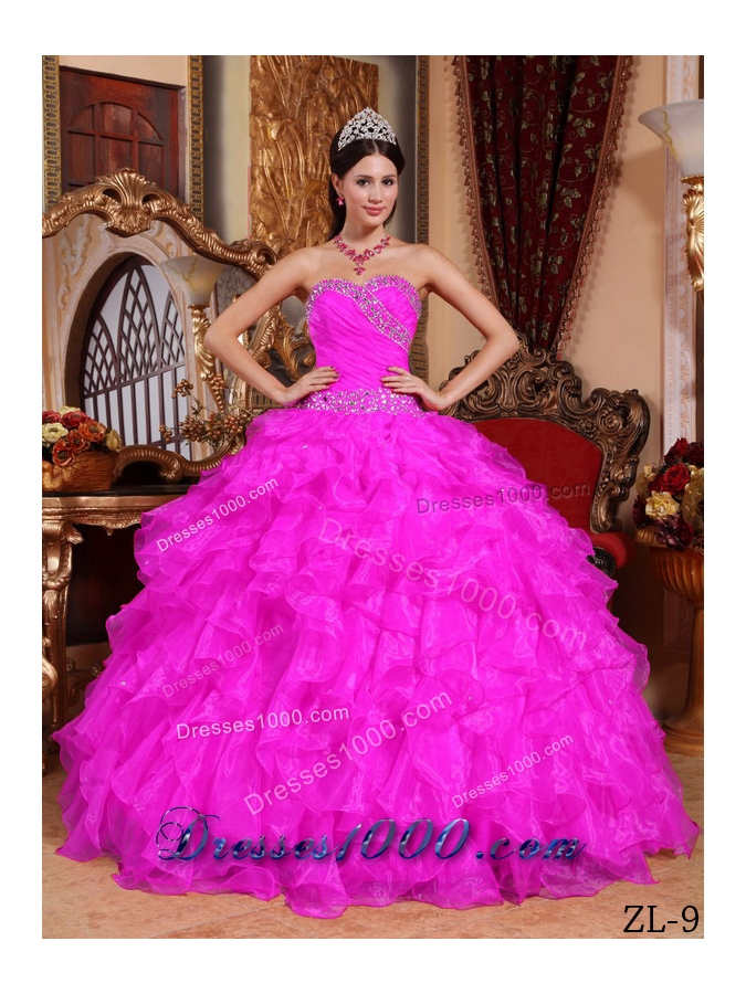 Hot Pink Ball Gown Sweetheart Floor-length Organza Beading Quinceanera Dress