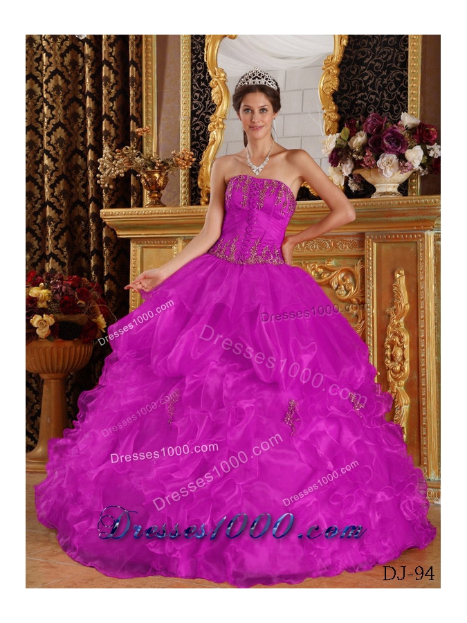 Strapless Appliques and Pick-ups Organza Quinceanera Dress in Fuchsia