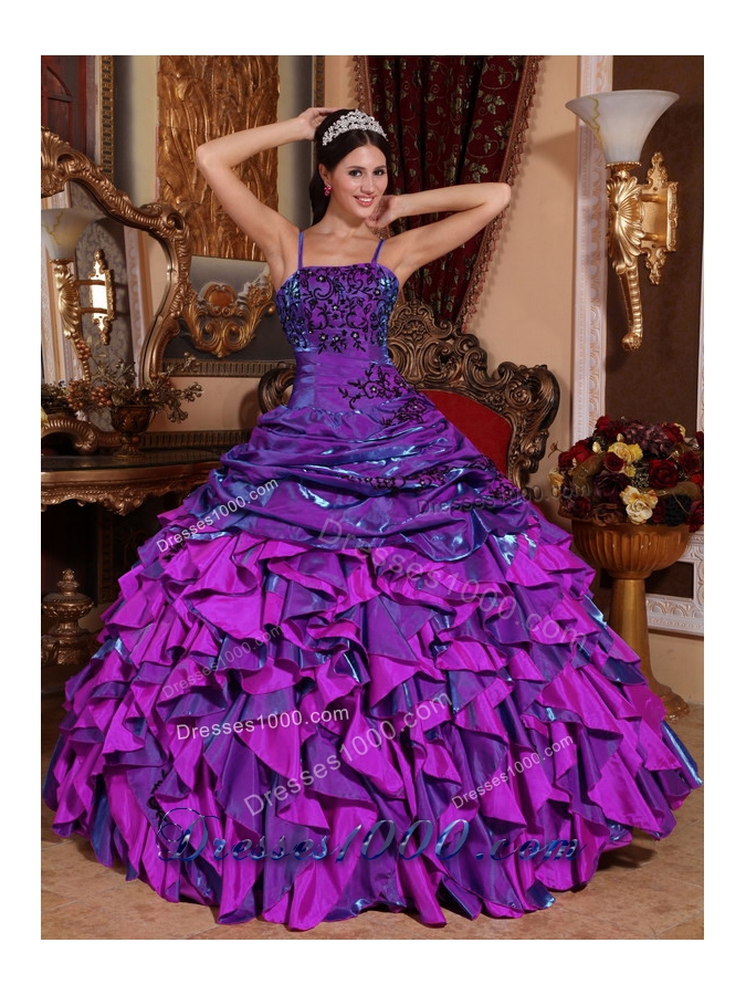 This exclusive strap quinceanera dress is featured with the two toned fabric at the bottom of the dress which is accented with the combination of ruffles in two colors and the small skirt with pick ups. The top part of the dress is adorned wirh black embroidery, You will become the most beautiful girl in this dress!