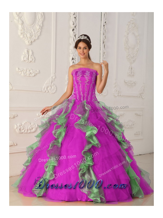 Strapless Fuchsia and Green Quinceanera Gowns with Appliques and Beading