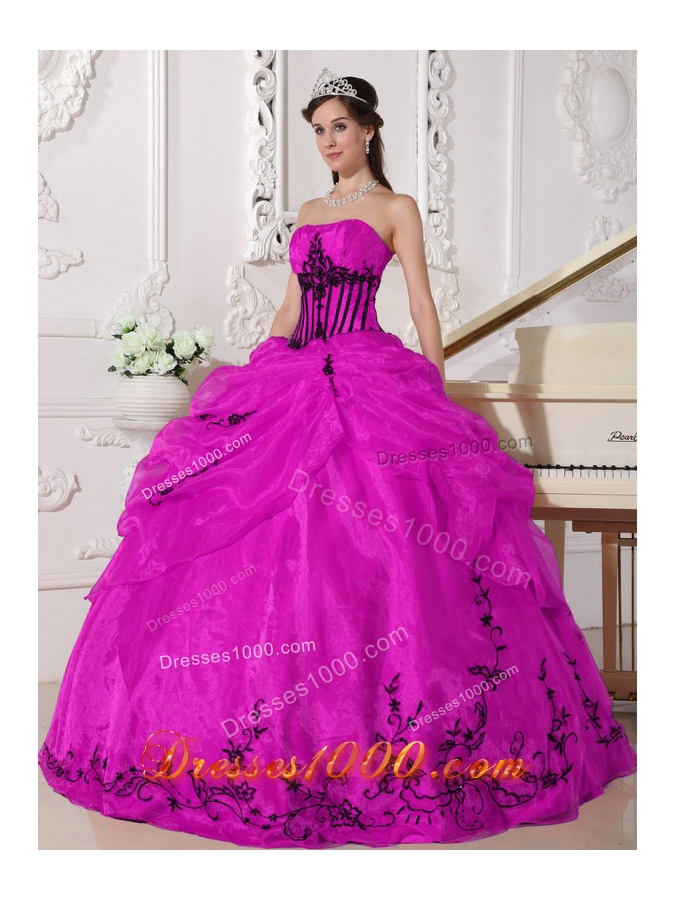 Strapless Fuchsia Organza Quinceanera Gowns with Black Appliques