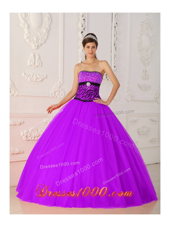 Fuchsia A-line / Princess Strapless Tulle and Zebra Beading Quinceanera Dress