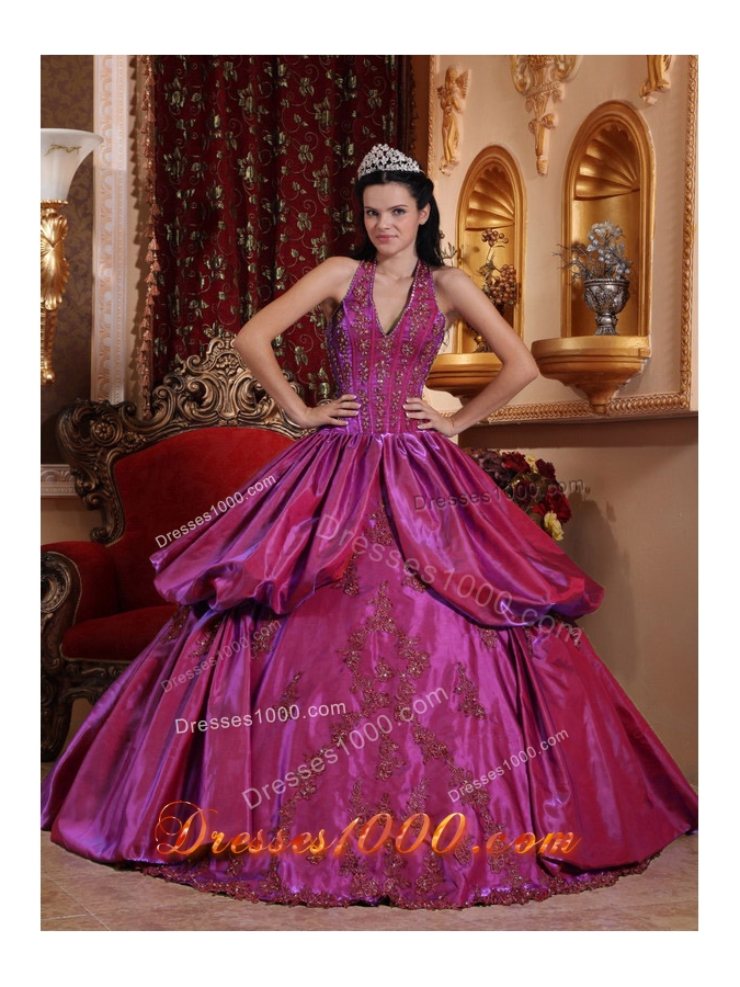 Fuchsia Halter Top Neck Taffeta Appliques Decorate Sweet Sixteen Dresses