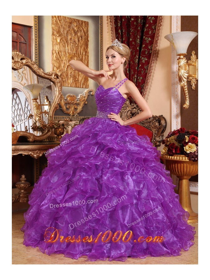 Purple One Shoulder Organza Quinceanera Gowns with Beading and Ruffles