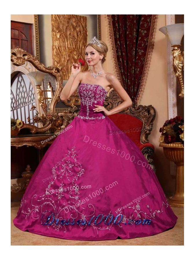 Strapless Fuchsia Satin Quinceanera Dress with White Embroidery