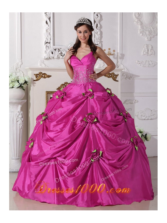 Spaghetti Straps Taffeta Quinceanera Gown with Beading and Hand Made Flowers