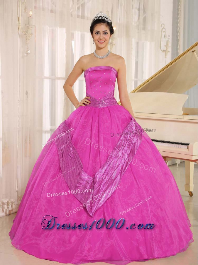 This Hot Pink quinceanera dress is simple yet gorgeous! The strapless sweetheart neckline on a structured bodice with shimmering beading makes the gown so elegant and exquisite that you will surely gain more attention. The asymmetrical waistband with ruching adds some details to the dress. The bouffant skirt has stunning fabric overlay embellished with V-shaped fabric that creates an unique effect. The corset closure in the back completes this wonderful dress. You'll feel like a queen in this dress!