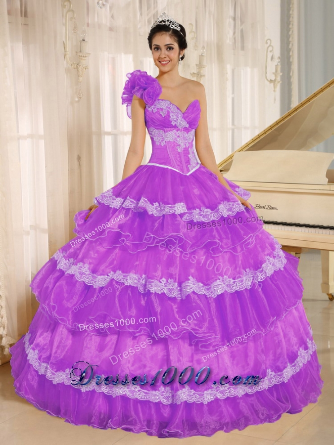 Hand Made Flowers Decorate One Shoulder Quinceanera Dress with Appliques