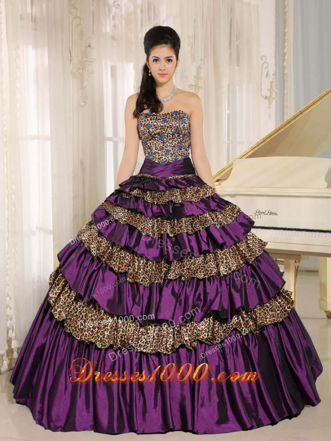 2014 Purple Leopard Ruffled Layers and Appliques With Beading Quinceanera Dress