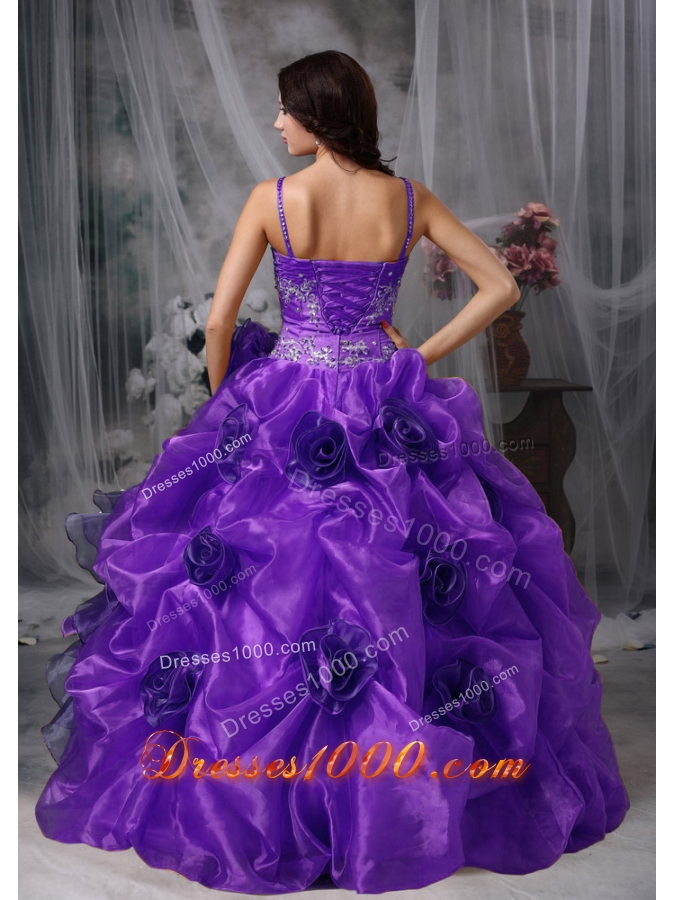 Feel like a queen in this ball gown. This exceptional gown features two shoulder straps with a V neckline and small jewels sprinkled throughout the bust and bodice down to the waist. Ruffles in contrasting colors create a full skirt that is sure to add a glamorous feel to the night. The sparsely scattered hand-made flowers add more romance to this dress. An elegant lace up back will flatter most figures.