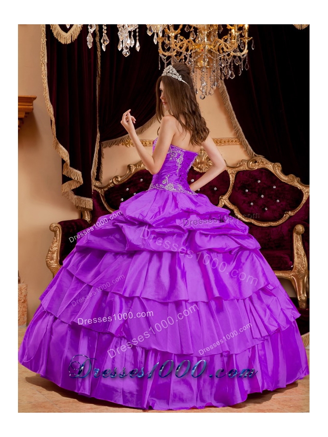 Purple Ball Gown Sweetheart Quinceanera Dress with Ruffled Layers and Appliques