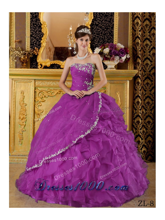 Purple Ball Gown Strapless Organza Appliques Quinceanera Dresses Gowns with Ruffles