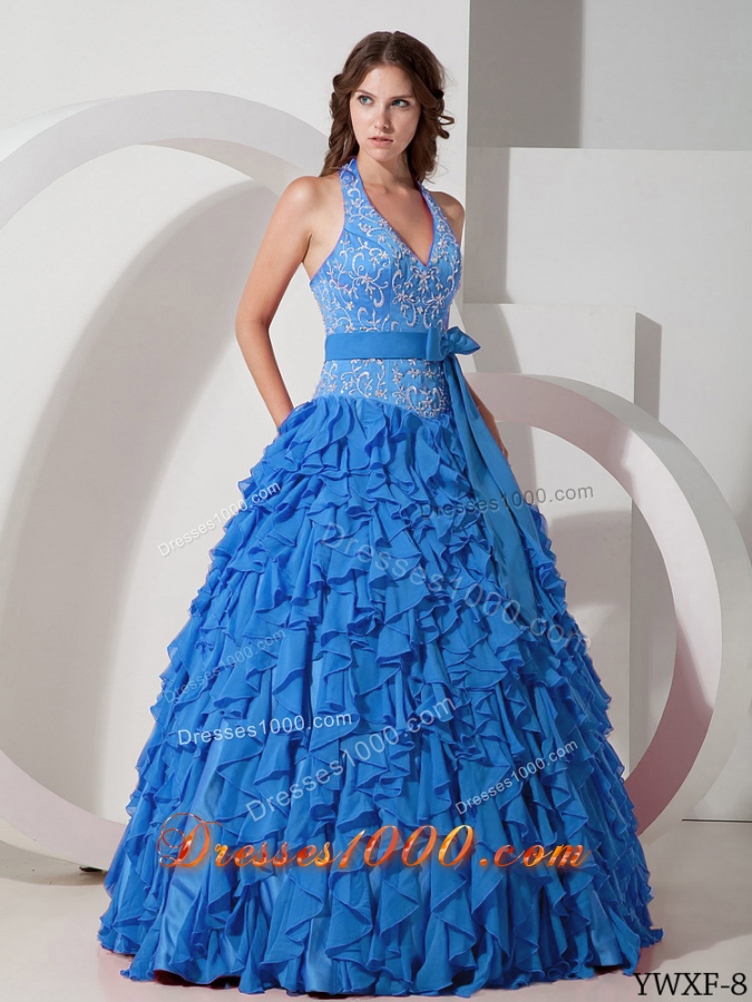 2014 Blue Puffy Halter Ruffles Quinceanera Dress with Bow