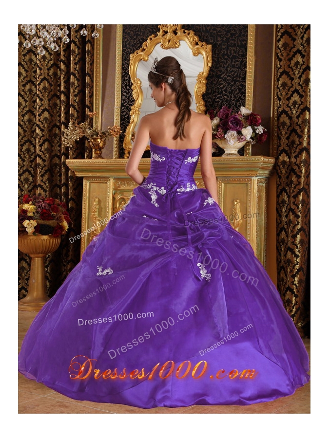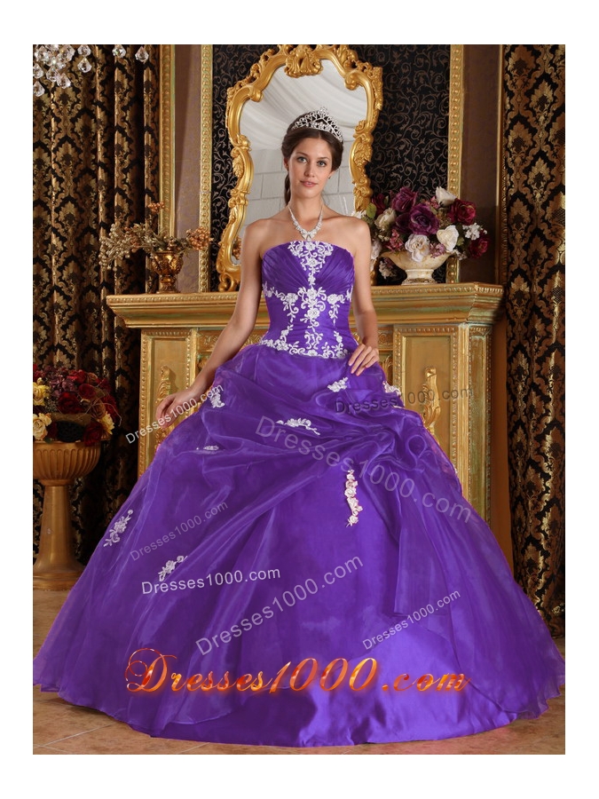 Eggplant Purple Ball Gown Strapless Quinceanera Dress with Appliques and Pick-ups