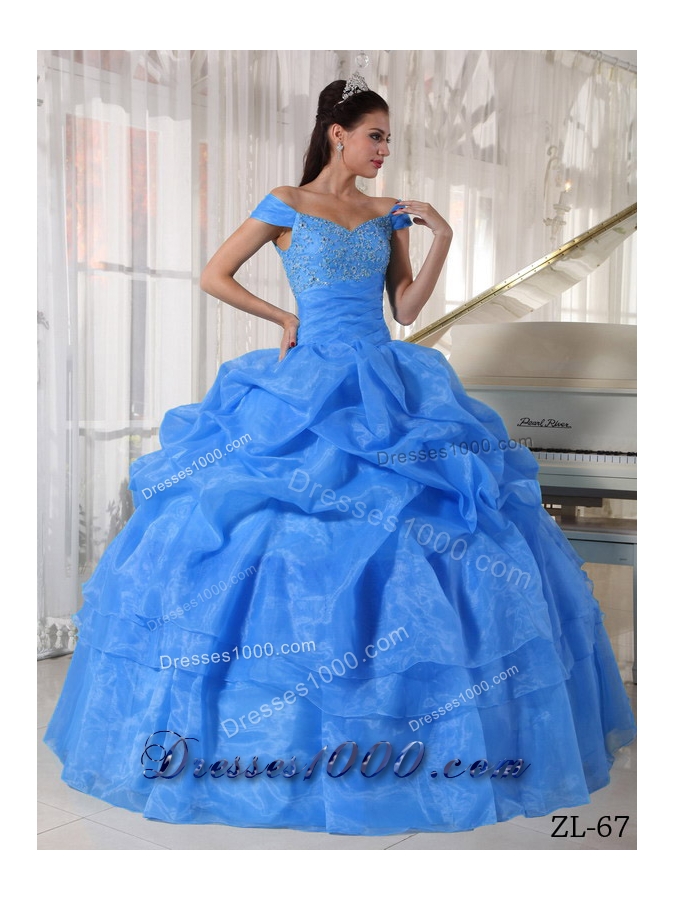 2014 Blue Puffy Off The Shoulder Beading Quinceanera Dress with Pick-ups