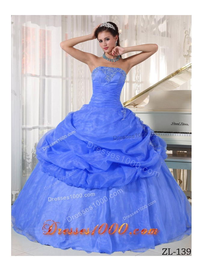 2014 Exclusive Blue Puffy Strapless Appliques Quinceanera Dress with Pick-ups