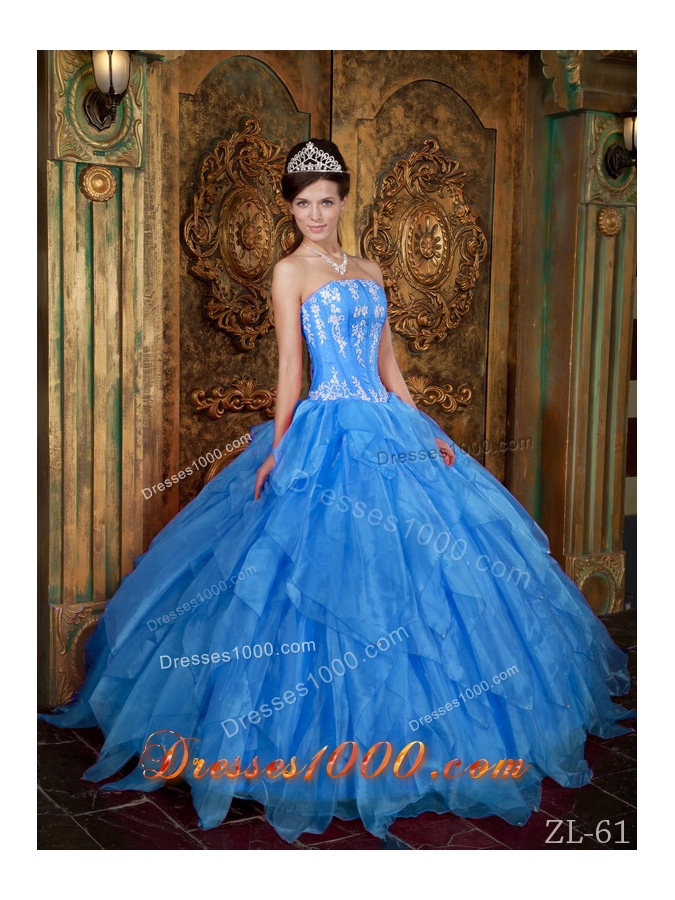 2014 Gorgeous Puffy Strapless in Blue Appliques Quinceanera Dress with Ruffles
