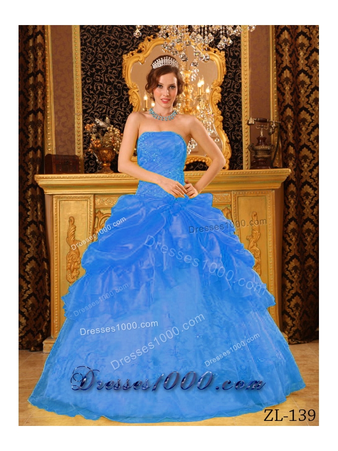 2014 Cute Blue Puffy Strapless Appliques Quinceanera Dress with Beading
