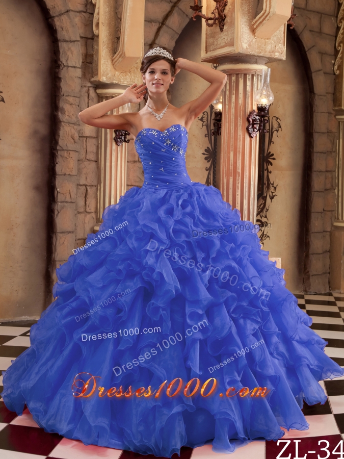 2014 Simple Royal Blue Sweetheart Puffy Ruffles Quinceanera Dress with Beading