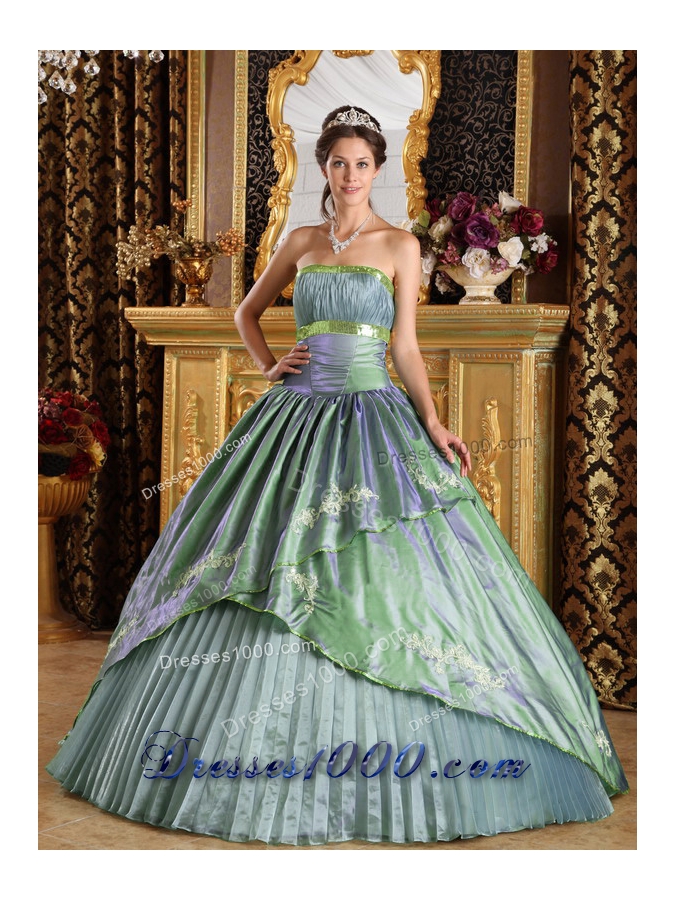 Stand out in the flounced skirt! This gorgeous chameleon fabric green quinceanera dress is featured with lotus leaves ornamented with exquisite appliques covering the bottom of the dress. The pleated dress at the lower part gives a distinctive outline. With the rushed bust area embraced with gold-plated bands, the bodice looks shiny and special. A perfect dress for youe sweet quinceanera!