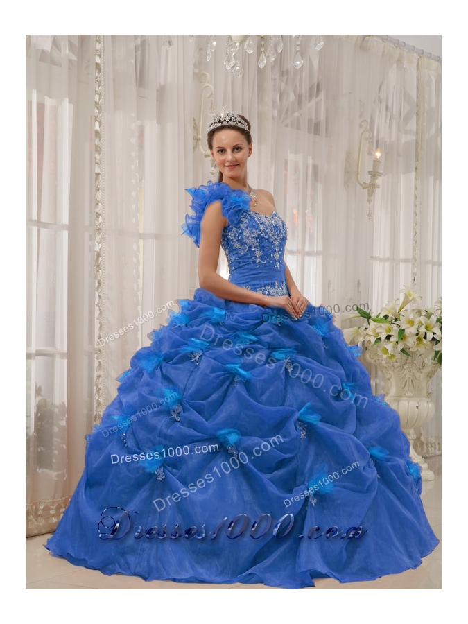 2014 Perfect Blue Puffy One-shoulder Quinceanera Dress with Appliques and Beading