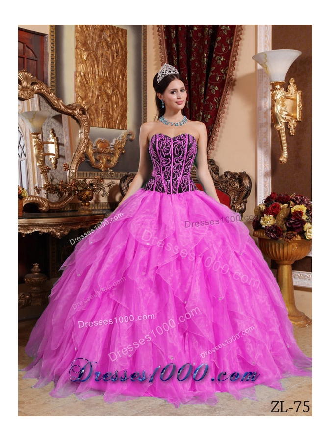 Hot Pink Ball Gown Sweetheart Floor-length Organza Embroidery with Beading Quinceanera Dress