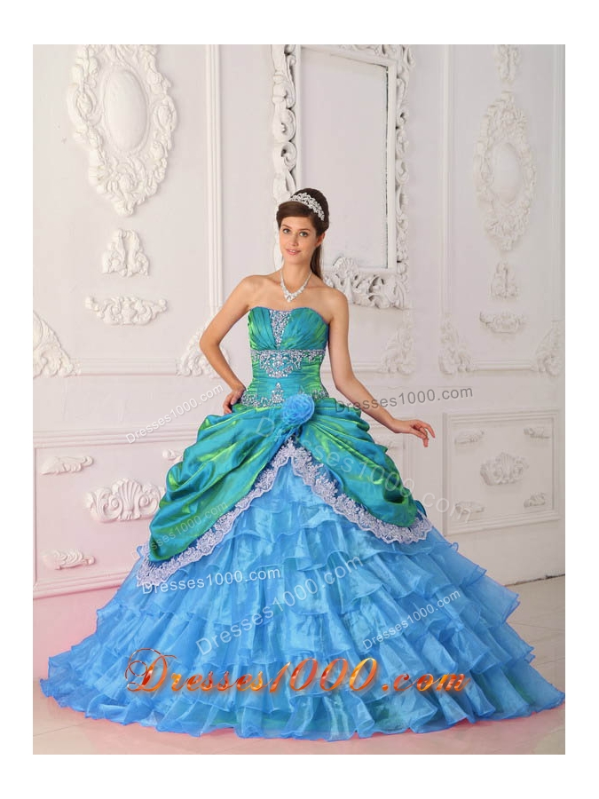 2014 CuteBlue Puffy Strapless Lace and Appliques Quinceanera Dress with Ruffled Layers