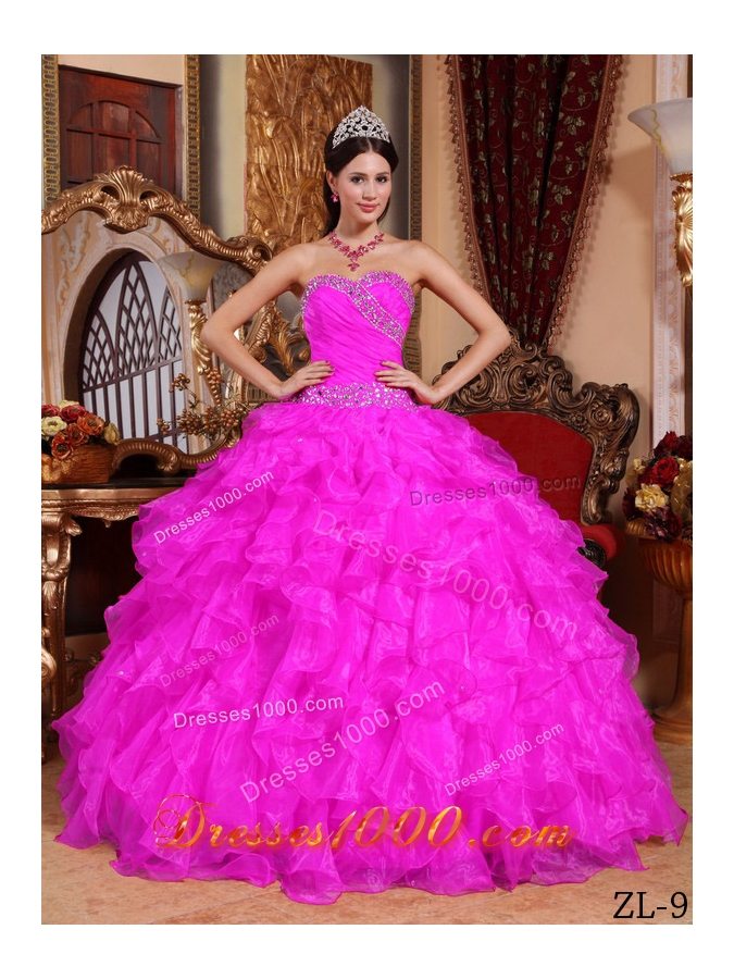 Hot Pink Ball Gown Sweetheart Floor-length Organza Beading Quinceanera Dress