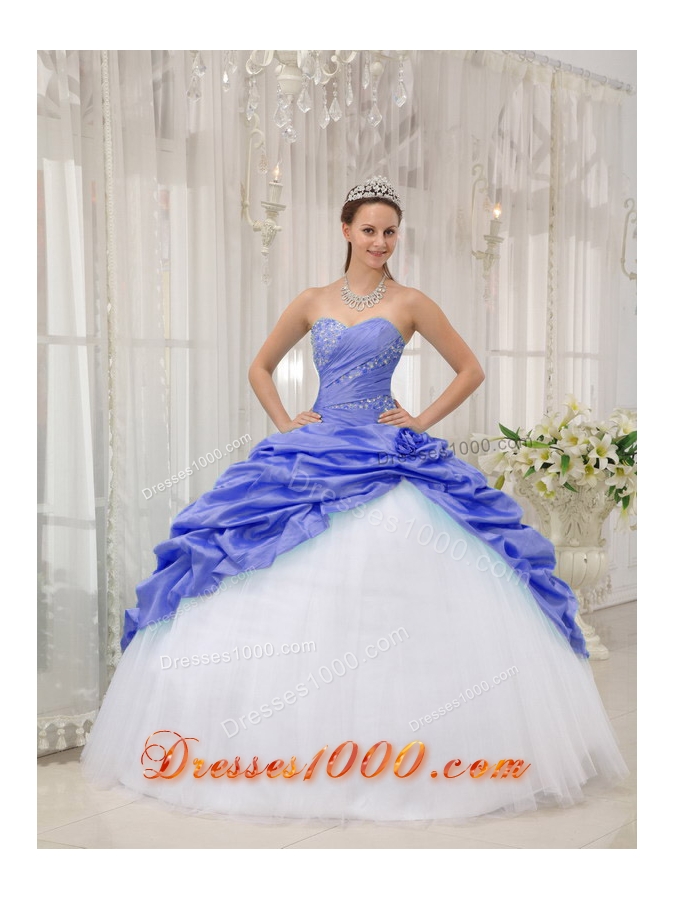 All eyes will definitely be focused on you because of this stunning evening gown!This blue and white quinceanera dress will make you become the most popular one. The fitted bodice with a sweetheart neckline characterized by the shimmering scattered beadings and the ruching makes this gorgeous dress graceful and tasteful. The bouffant skirt in a contrasting color with the stunning fabric makes the design a unique one. Especially the flowers in the side of the waist area of the skrit is so exquisite and dainty that can not be forgotten. The lace up closure in the back completes this wonderful dress.