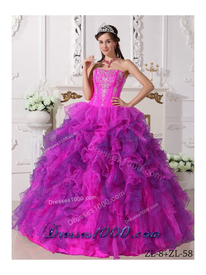 Fuchsia Sweetheart Satin and Organza Quinceanera Gown with Embroidery