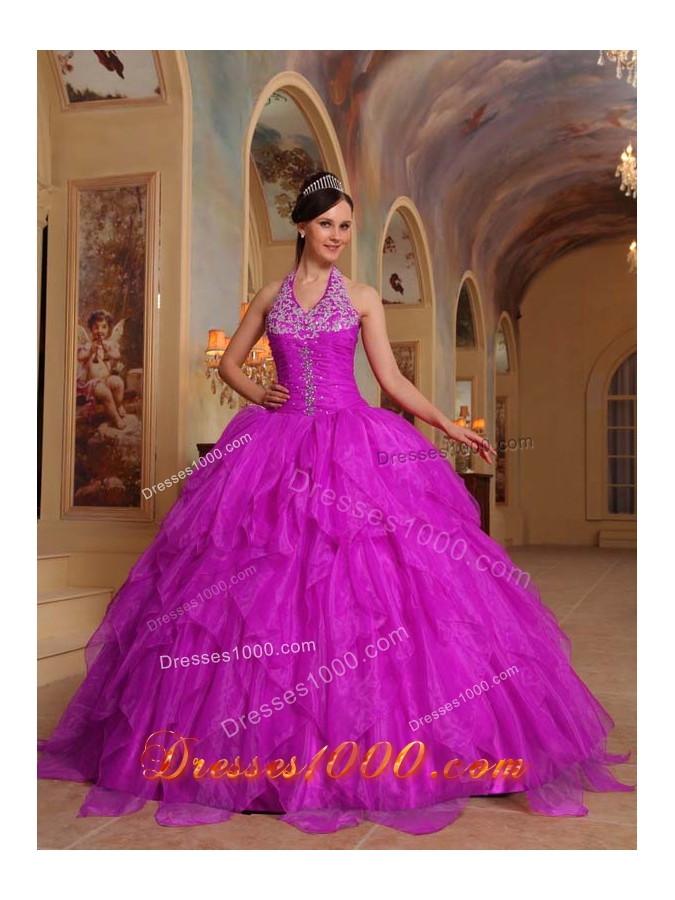 Fuchsia Quinceanera Dresses, Fuchsia Halter Organza Quinceanera Dress with Appliques and Beading