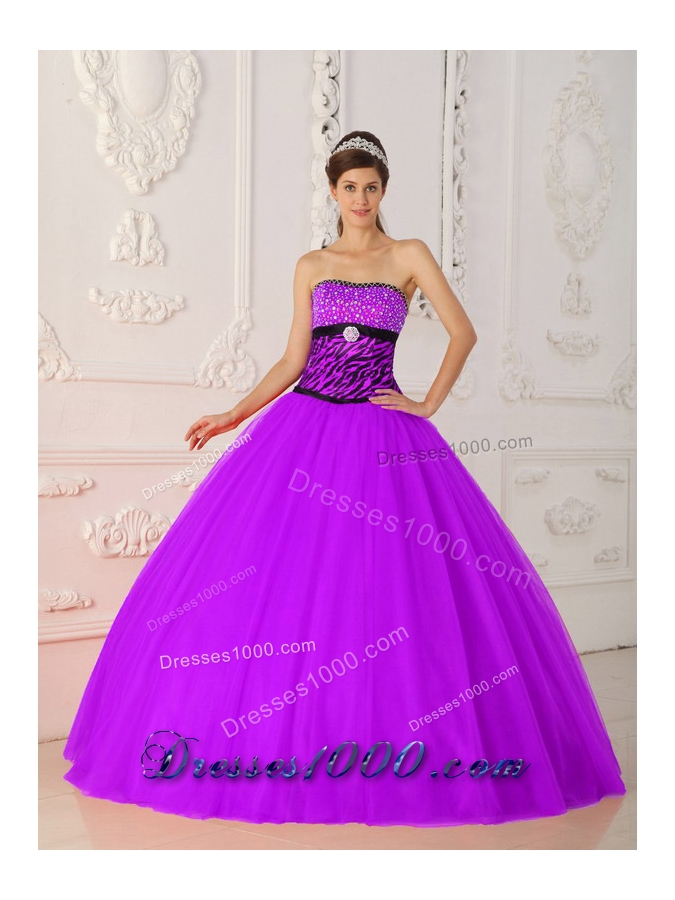 Fuchsia Quinceanera Dresses, Fuchsia A-line / Princess Strapless Tulle and Zebra Beading Quinceanera Dress
