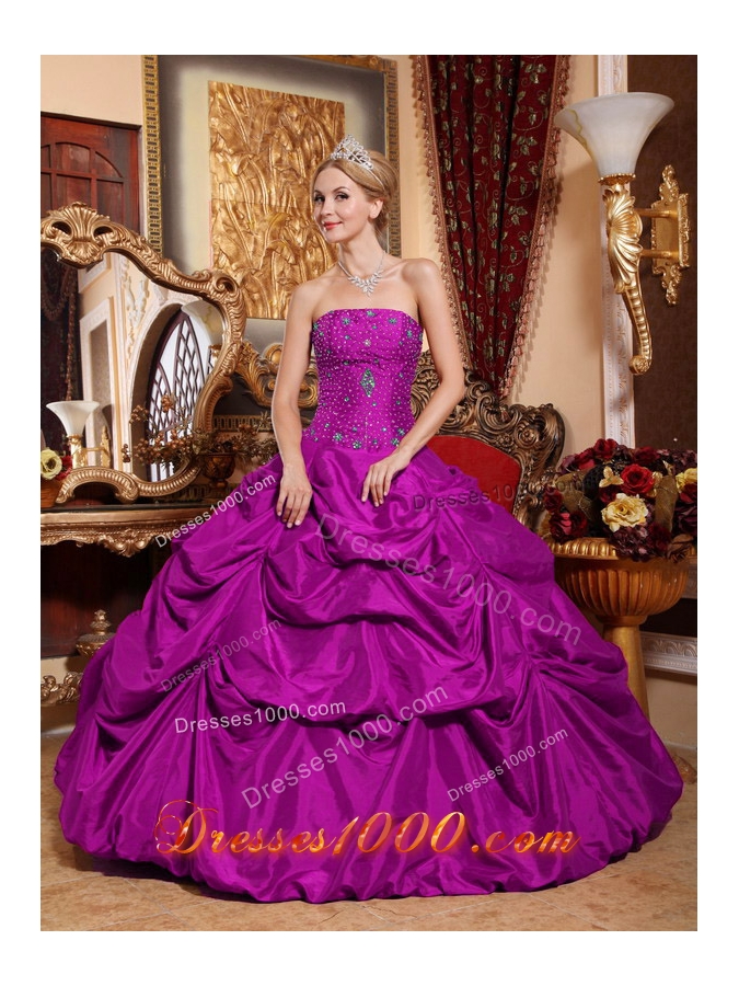 Fuchsia Quinceanera Dresses, Fuchsia Strapless Taffeta Quinceanera Dress with Beading and Pick-ups