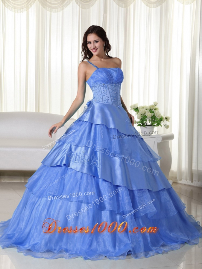 Discount Blue Puffy One Shoulder for 2014 Beading Quinceanera Dress with Ruffled Layers