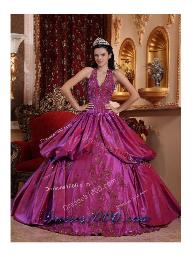 Fuchsia Halter Top Neck Taffeta Appliques Decorate Sweet Sixteen Dresses
