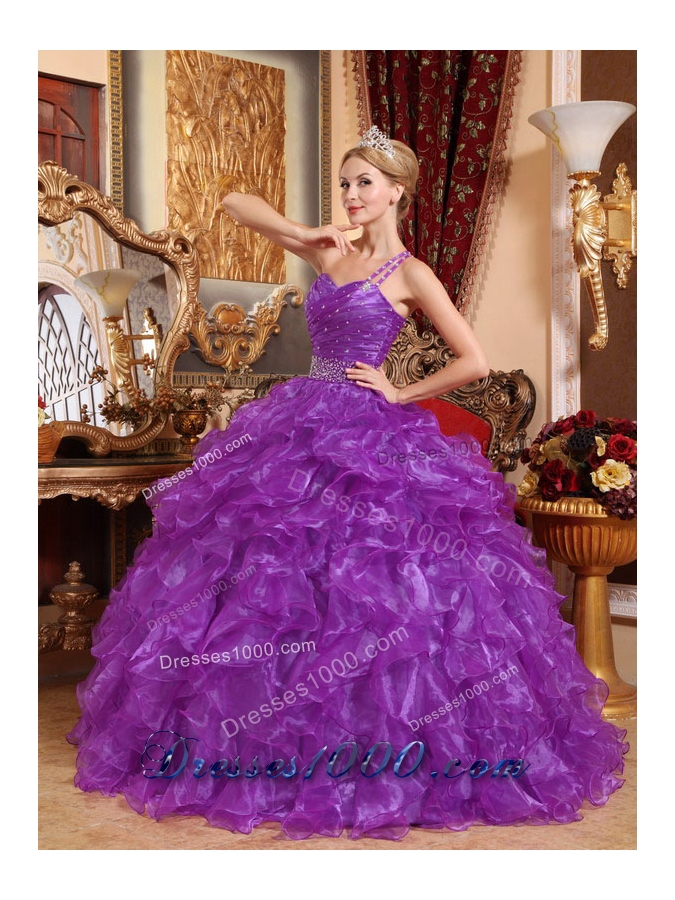 Purple One Shoulder Organza Quinceanera Gowns with Beading and Ruffles