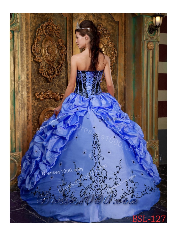 2014 Discount Blue Puffy Strapless Embroidery Quinceanera Dress with Pick-ups