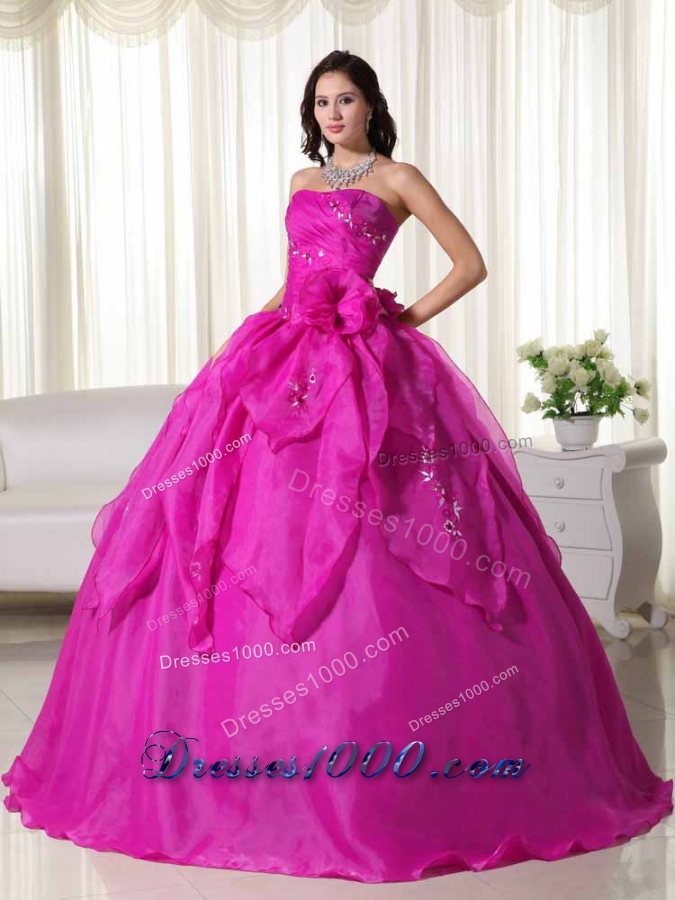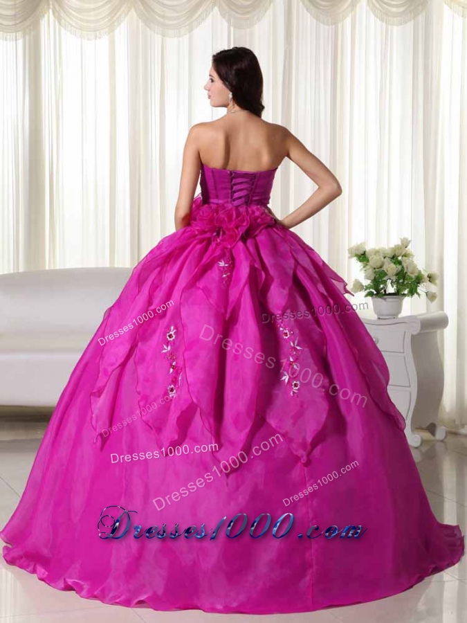 Fuchsia Strapless Organza Appliques and Hand Made Flowers Quinceanera Dress