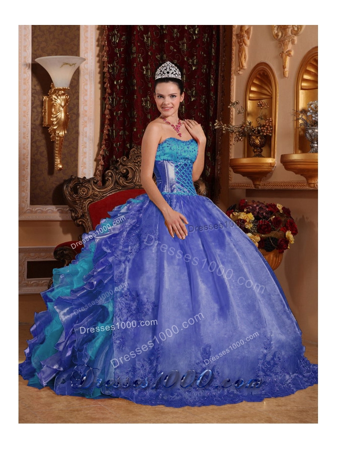 2014 Cheap Puffy Blue Ruffles Quinceanera Dress with Embroidery